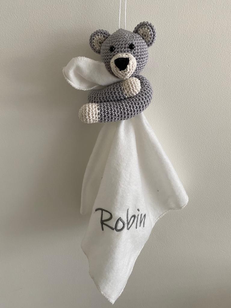 Deze lieve knuffeldoekje is uniek gemaakt. Om het extra uniek te maken, kan ik de naam van de baby erop borduren. Dat maakt het een echte eyecatcher in de kraamperiode. Leuk om te geven voor een kraambezoek, kraamfeest of babyshower.