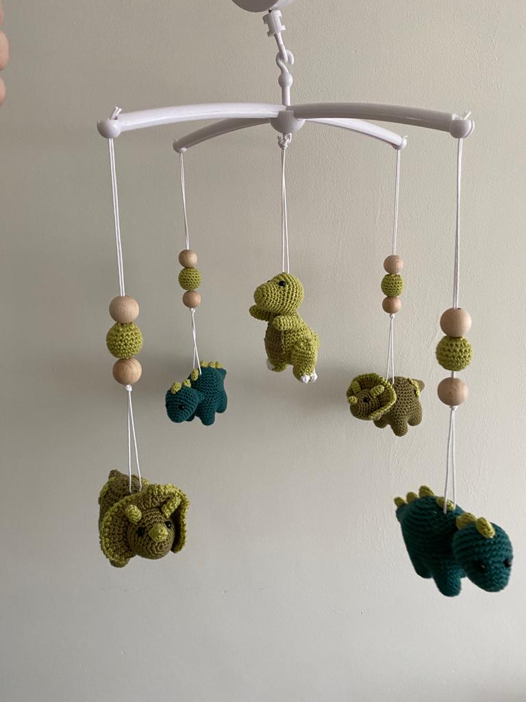 Deze mooie muziekmobiel met dino’s werkt rustgevend voor baby’s dankzij het lieve slaapliedje. Aan de mobiel hangen vier hangers in het dino-thema die het heerlijk vinden om rondjes te vliegen om je baby te vermaken. Baby’s kijken graag naar de beweging van deze speeltjes, wat hun visuele ontwikkeling stimuleert. De muziekmobiel is geschikt vanaf de geboorte en eenvoudig te bevestigen aan het kinderbed of de box. Leuk om te geven voor een babyshower, kraamfeest of kraambezoek. Alle beestjes worden met de hand gemaakt met veel liefde.