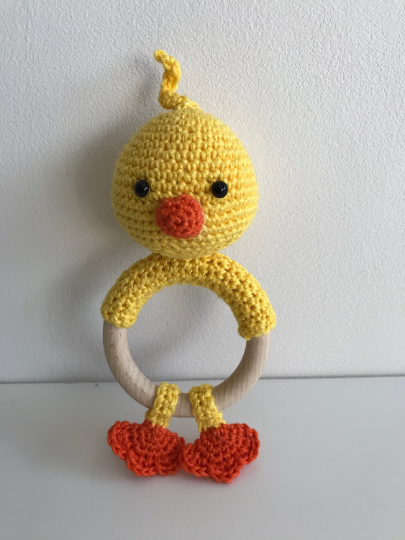 Deze vrolijke rammelaar kuiken heeft een houten ring en maakt een rammelend geluidje als je baby hem beweegt. De rammelaar voelt heerlijk zacht aan en de houten ring kan ook gebruikt worden als bijtring. De rammelaar heeft een doornsnede van 7 cm en is daardoor makkelijk vast te houden. De rammelaar bevordert de hand- oogcoördinatie en prikkelt de zintuigen. Leuk om te geven voor een babyshower, kraamfeest of kraambezoek.
