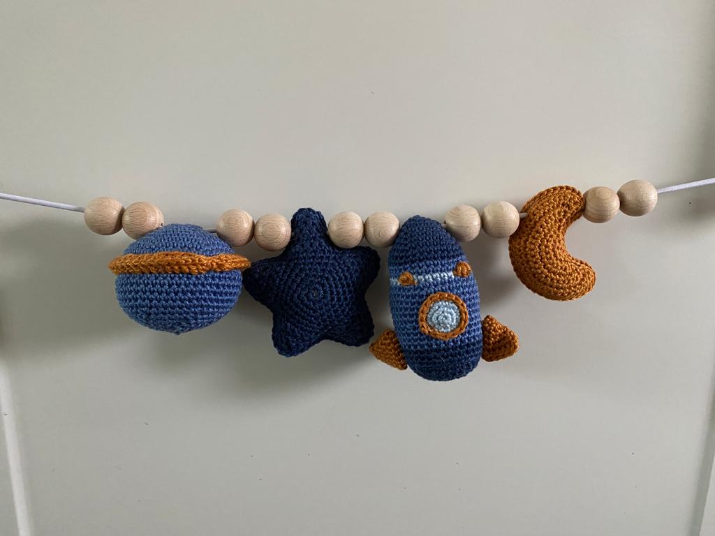 Deze vrolijke wagenspanner in het thema ruimtevaart voor aan de wandelwagen of maxi-cosi. De wagenspanner kan eenvoudig aan de kinderwagen of autostoel worden bevestigd doormiddel van de clips. Door het elastiek is de wagenspanner verstelbaar in verschillende maten. Deze vrolijke speeltjes hebben verschillende texturen en stimuleren baby’s om ze aan te raken en te ontdekken. De wagenspanner bevordert de hand- oogcoördinatie en prikkelt de zintuigen. Leuk om te geven voor een babyshower, kraamfeest of kraambezoek. Alle beestjes worden met de hand gemaakt met veel liefde.